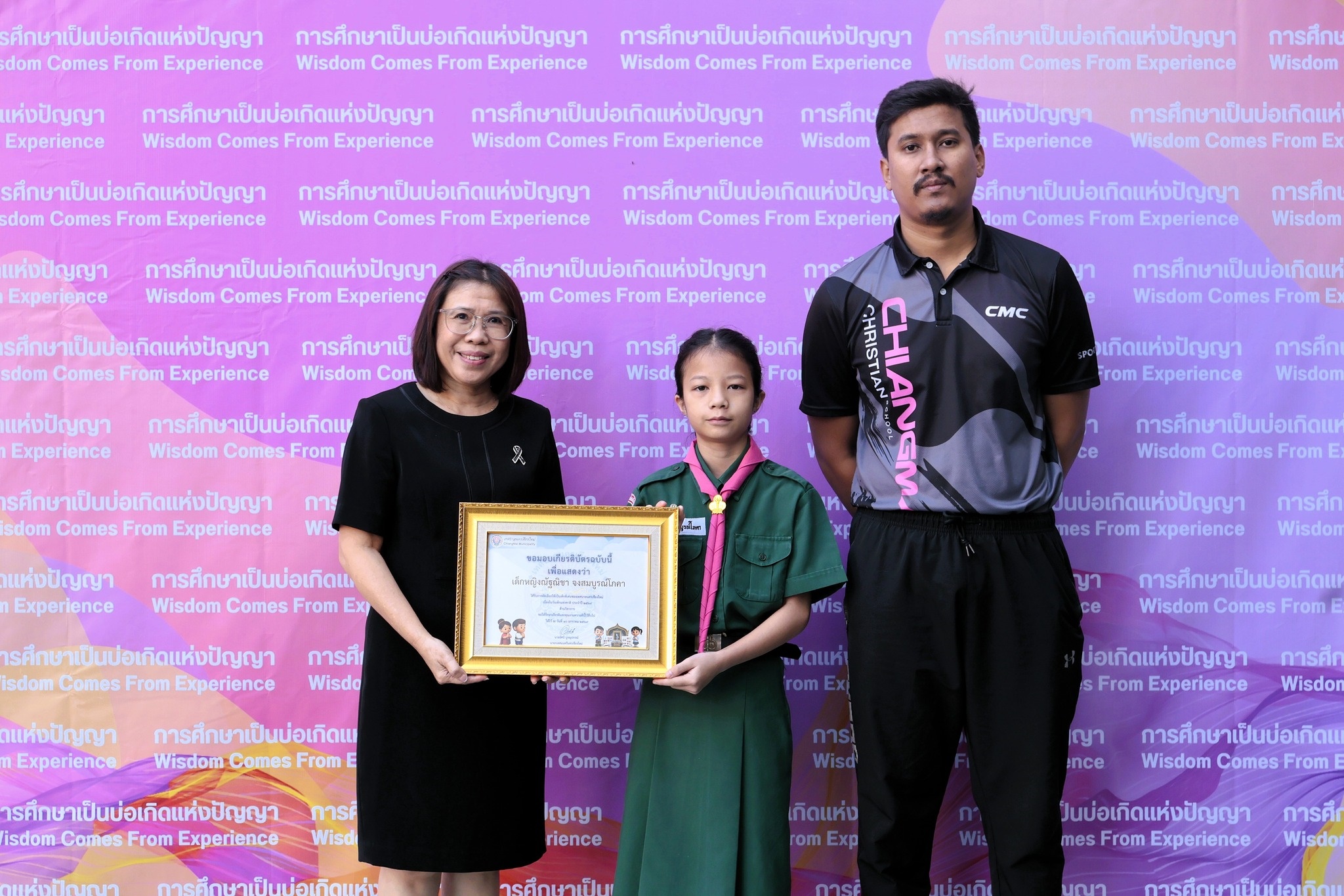 ศาสนาจารย์รำพรรณ สกุลปั้นทรัพย์ ผู้จัดการ-ผู้อำนวยการ แสดงความยินดีกับ เด็กหญิงณัฐณิชา จงสมบูรณ์โภคา ที่ได้รับรางวัล เด็กดีเด่นของเทศบาลนครเชียงใหม่ เนื่องในวันเด็กแห่งชาติ ประจำปี 2569