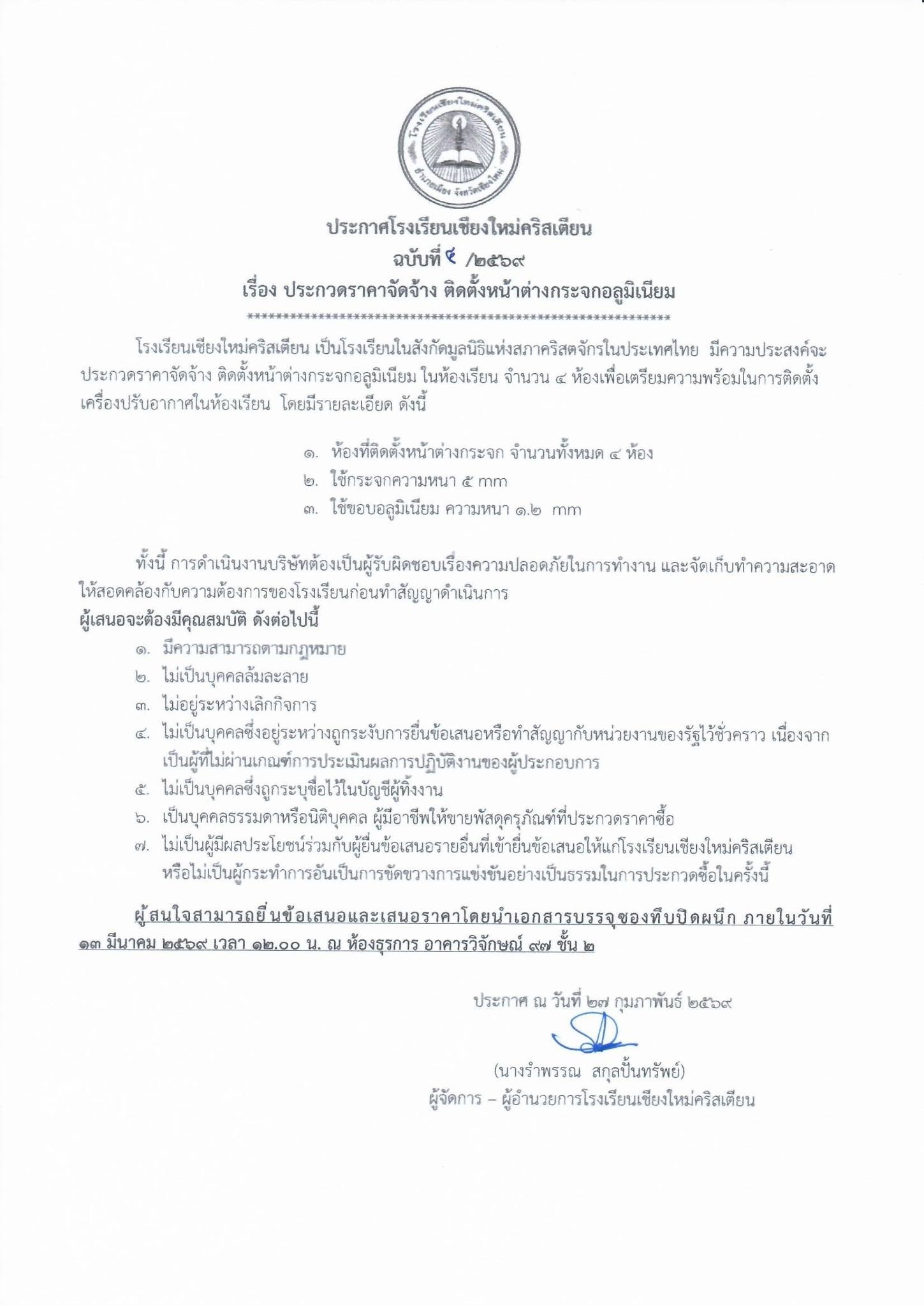 ประกาศ เรื่อง ประกวดราคาจัดจ้าง ติดตั้งหน้าต่างกระจกอลูมิเนียม